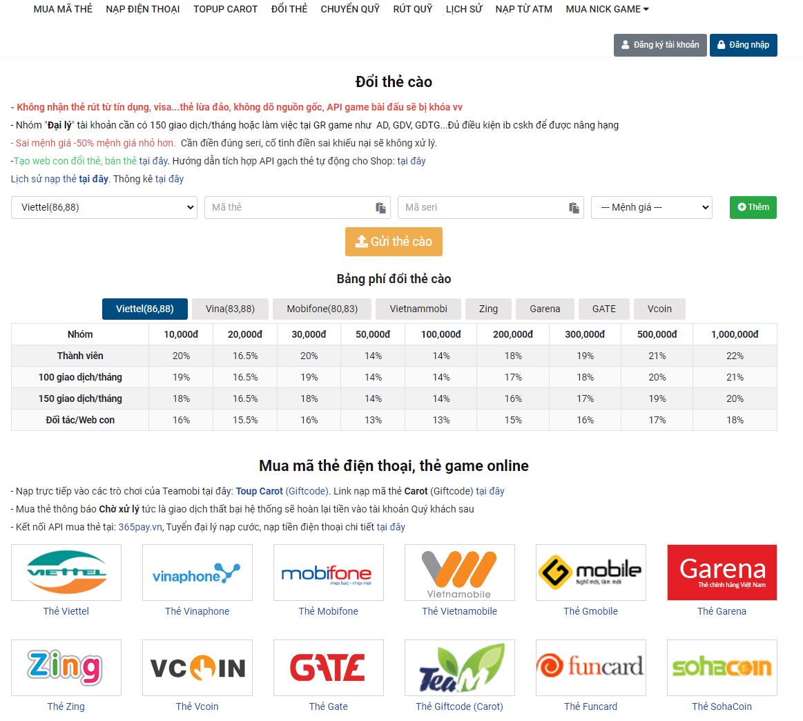 Code để xây dựng một trang web đổi thẻ cào, bán thẻ cào và nạp điện thoại tự động. Đây là một nguồn thu nhập tiềm năng và dự án hấp dẫn trong lĩnh vực thương mại điện tử và thanh toán trực tuyến.